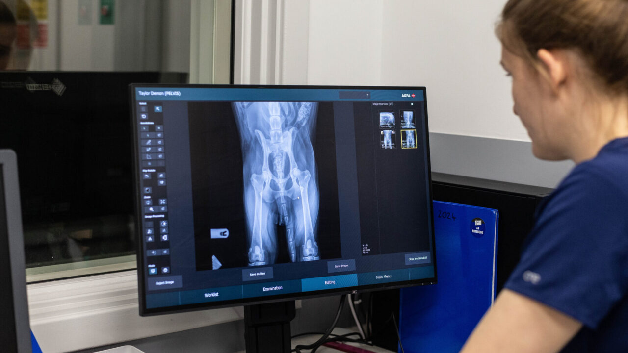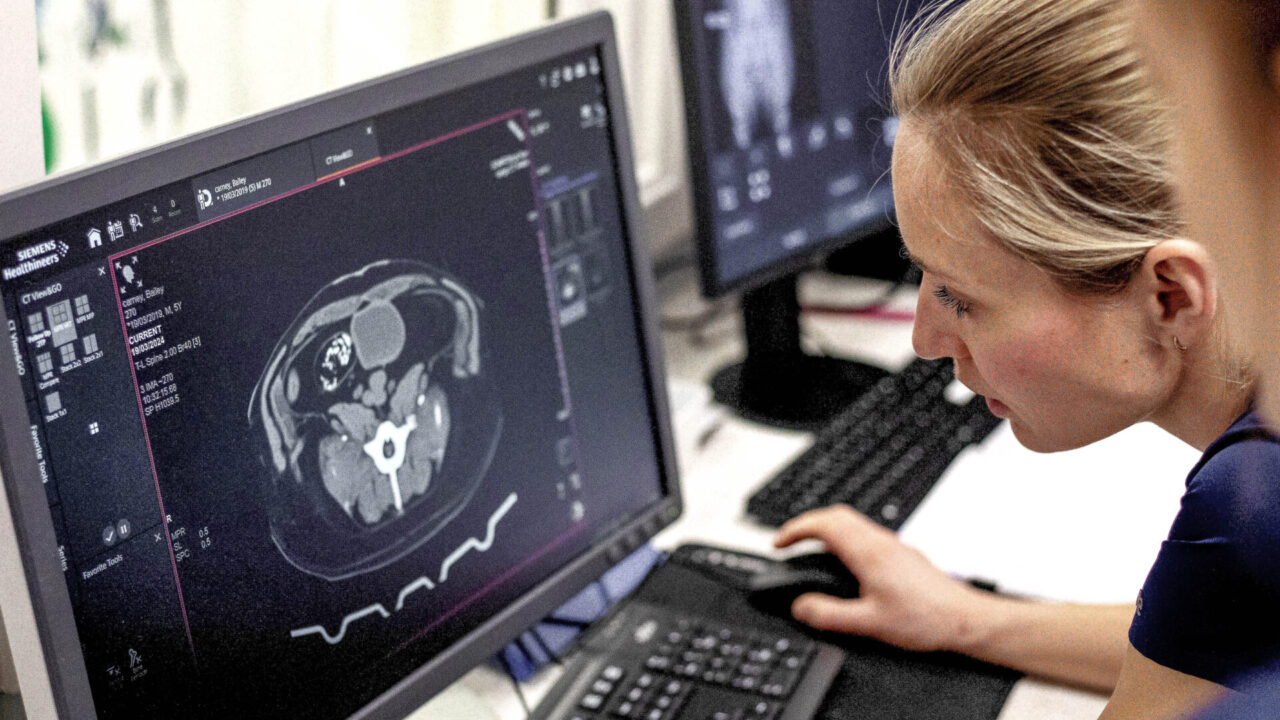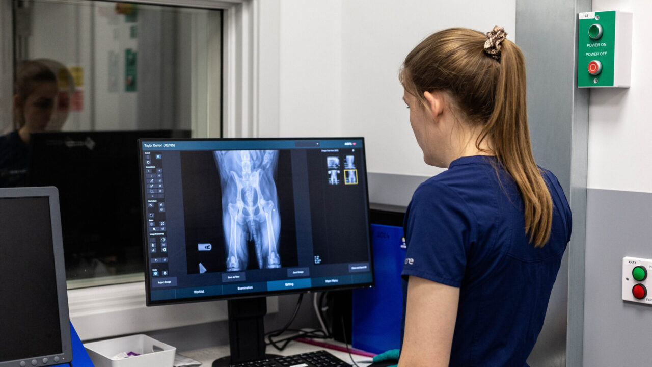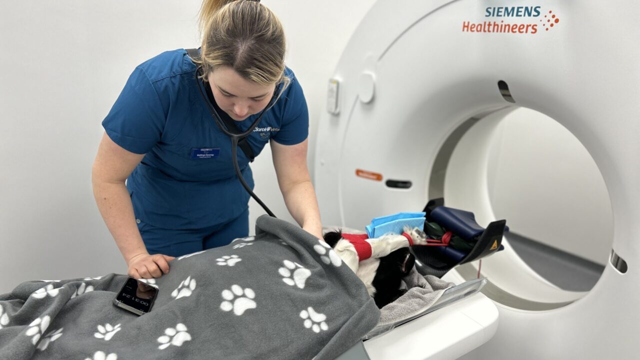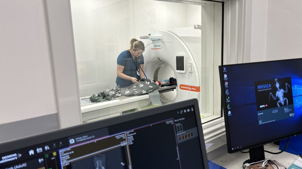 CT is essentially a 3D x-ray, taking very fine slices through the required body areas and CT is much more sensitive than radiography. CT is especially useful for assessing joints such as the elbows, checking for metastasis (cancerous spread) and assessing respiratory or gastrointestinal disease, amongst other things. At Claro Hill, we accept cases for CT imaging only on an outpatient basis. The patient will have blood tests prior to anaesthesia and we will run the scans to gain the images but will not have any clinical input in the case. We will not discuss diagnosis or treatment plans with the clients. The images will be sent externally to a diagnostic imager and a comprehensive report will be sent back to the referring vet for ongoing management of the case.